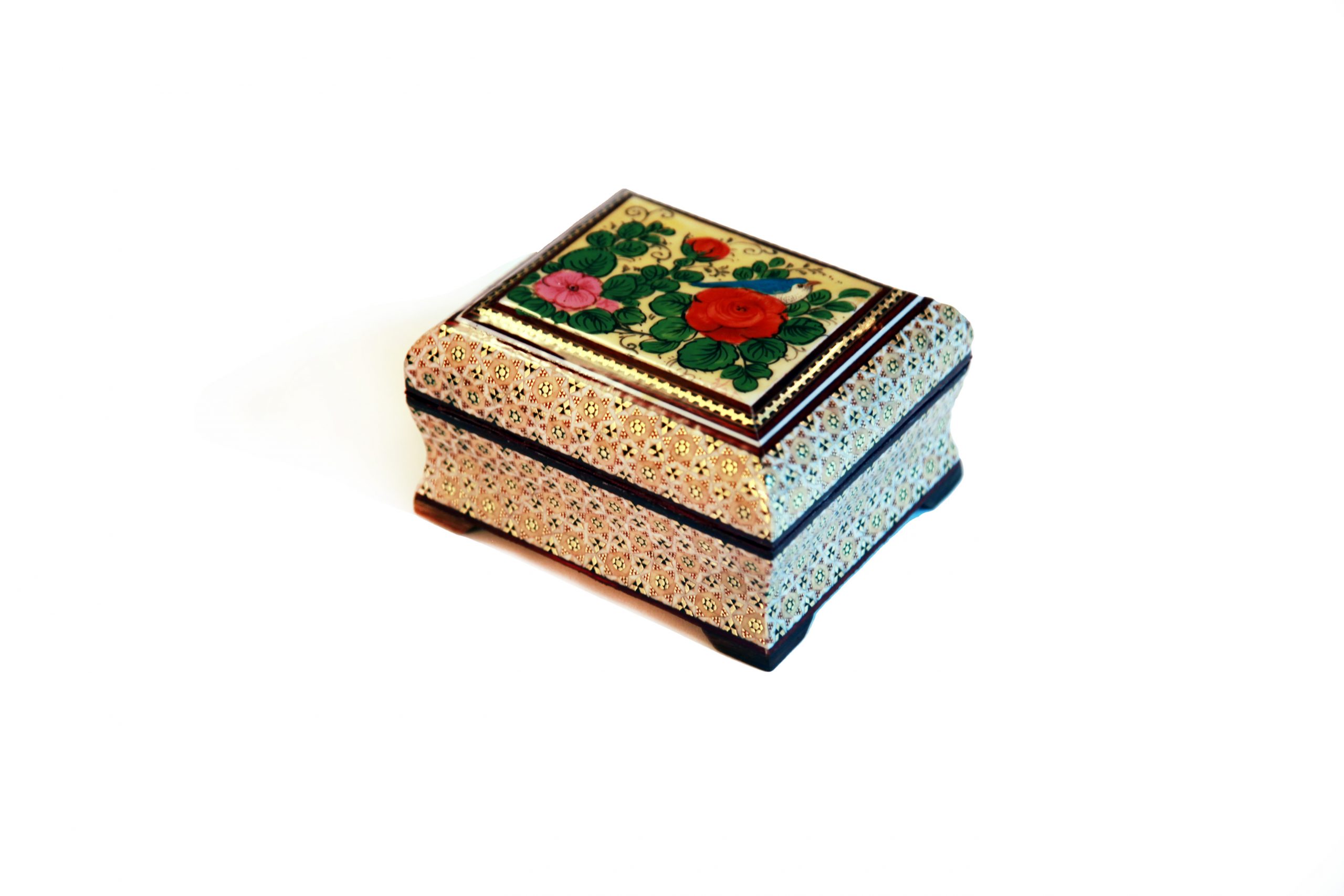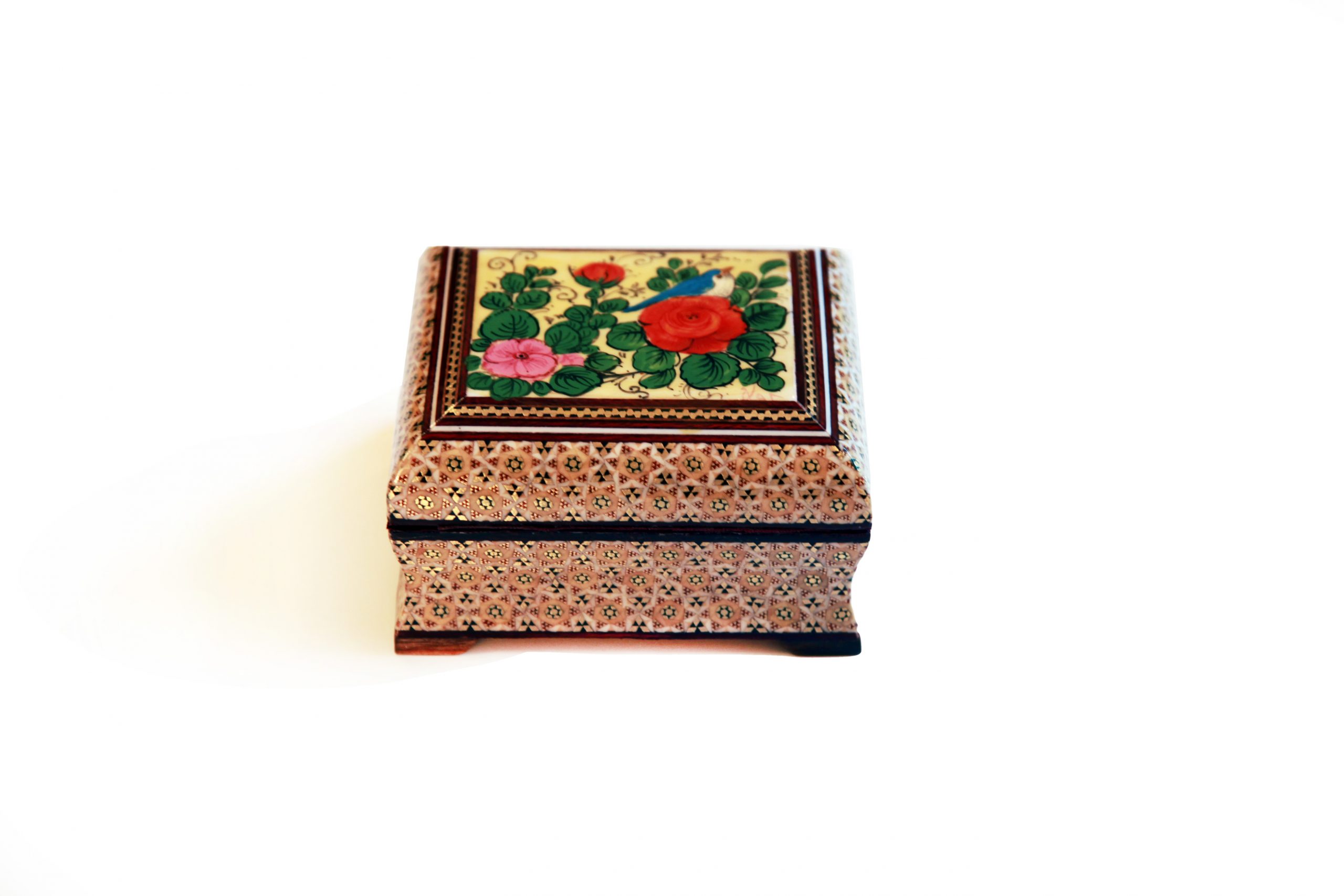 Handgjord ask med vackra blommor och traditionellt mönster (khātam) som är en gammal persisk teknik för inläggning. Det karaktäristiska geometriska mönstret består av noggrant skurna bitar av trä, ben och metall. Detta persiska hantverk är perfekt att användas som smyckeskrin.