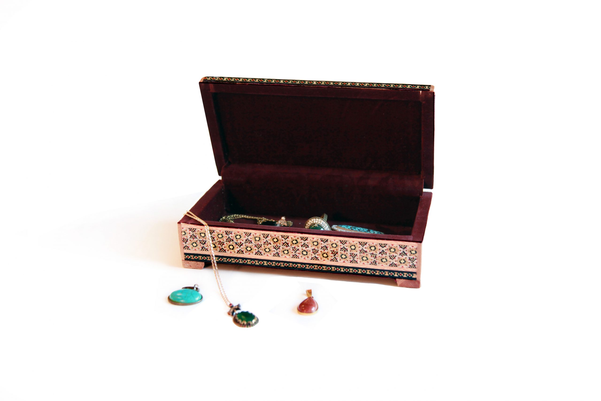 Handgjord ask med traditionellt mönster (khātam) som är en gammal persisk teknik för inläggning. Det karaktäristiska geometriska mönstret består av noggrant skurna bitar av trä, ben och metall. Detta persiska hantverk är perfekt att användas som smyckeskrin.