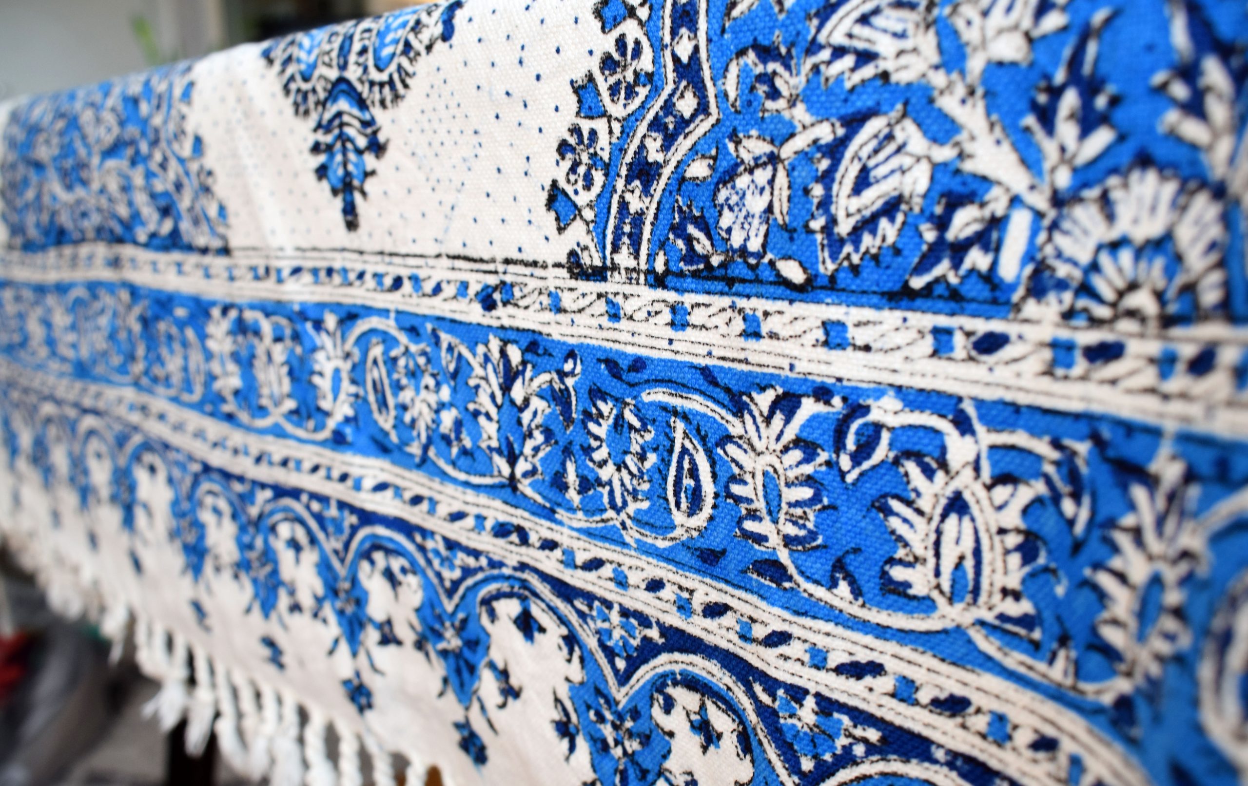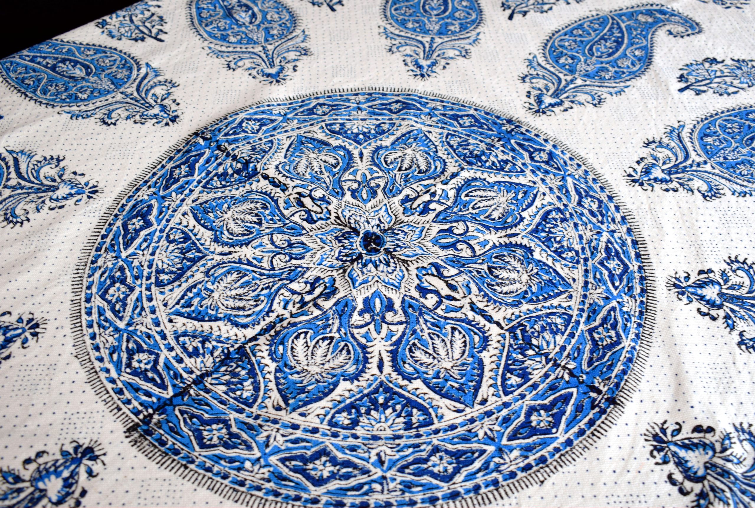 Persiskt hantverk i form av en vacker blåvit bordsduk i bomull med handtryckt paisleymönster i traditionell blockprintteknik.