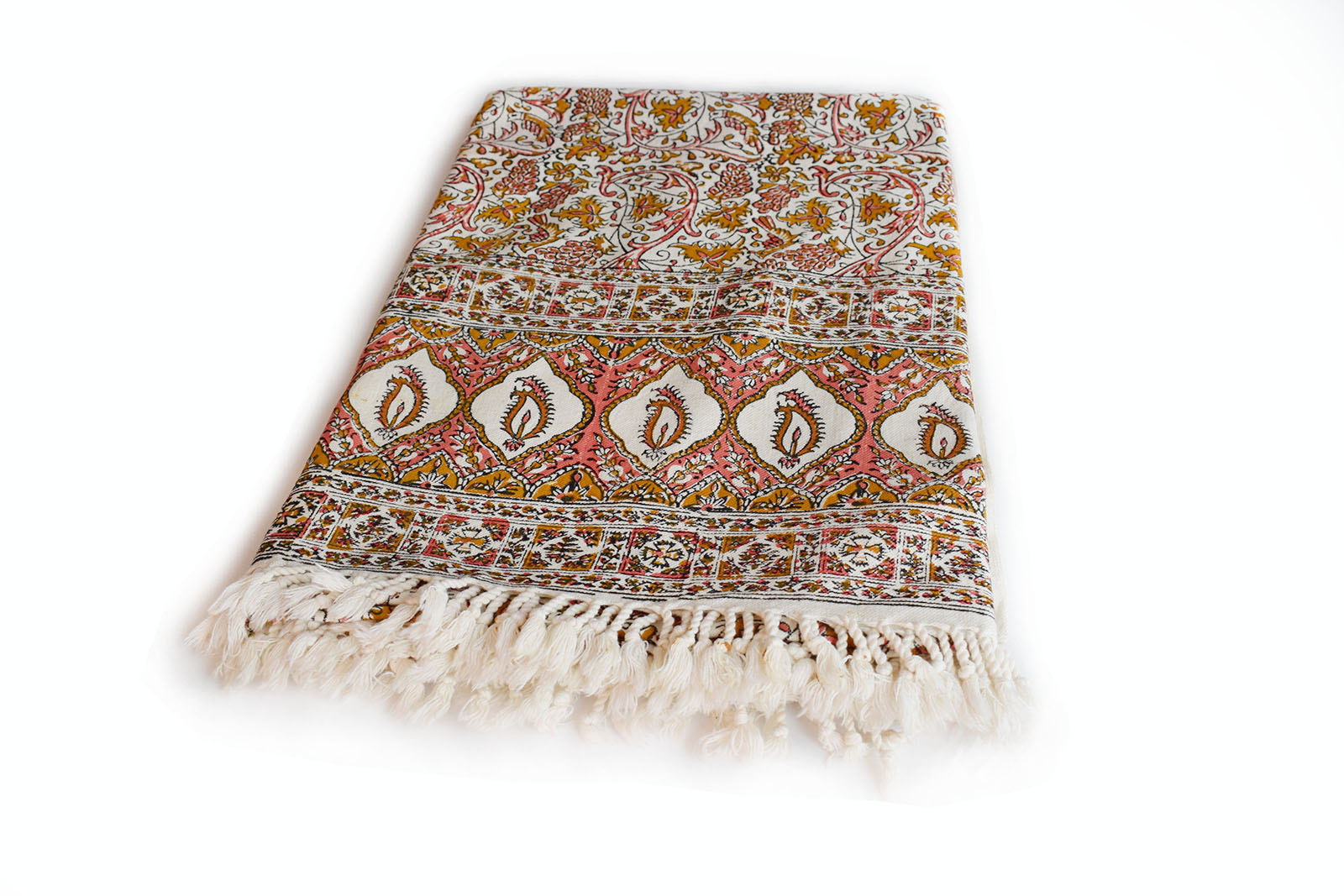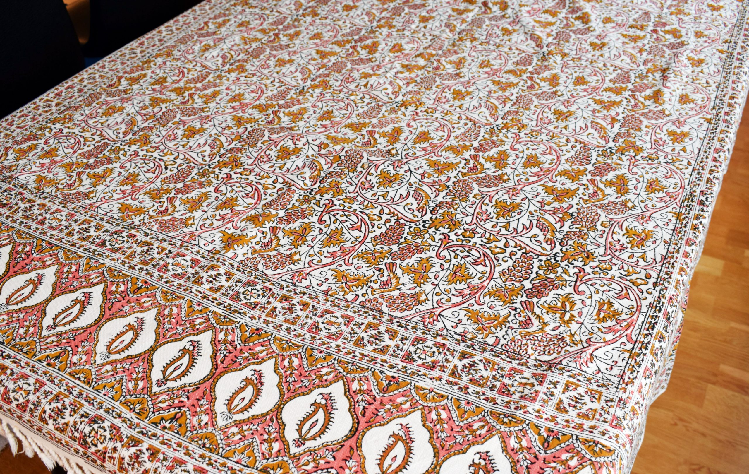 Persiskt hantverk i form av en unik bordsduk med varma toner i bomull med handtryckt mönster i traditionell blockprintteknik. Obs: Längd och bredd kan variera något, måtten är cirkamått. Tvättråd: Skontvätt 30°